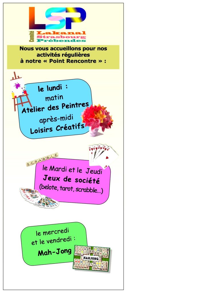 L’activité Mahjong se déroule au point rencontre du comité le mercredi soir, de 19h à 22h. Possibilité de venir s’initier le vendredi à partir de 14h30.