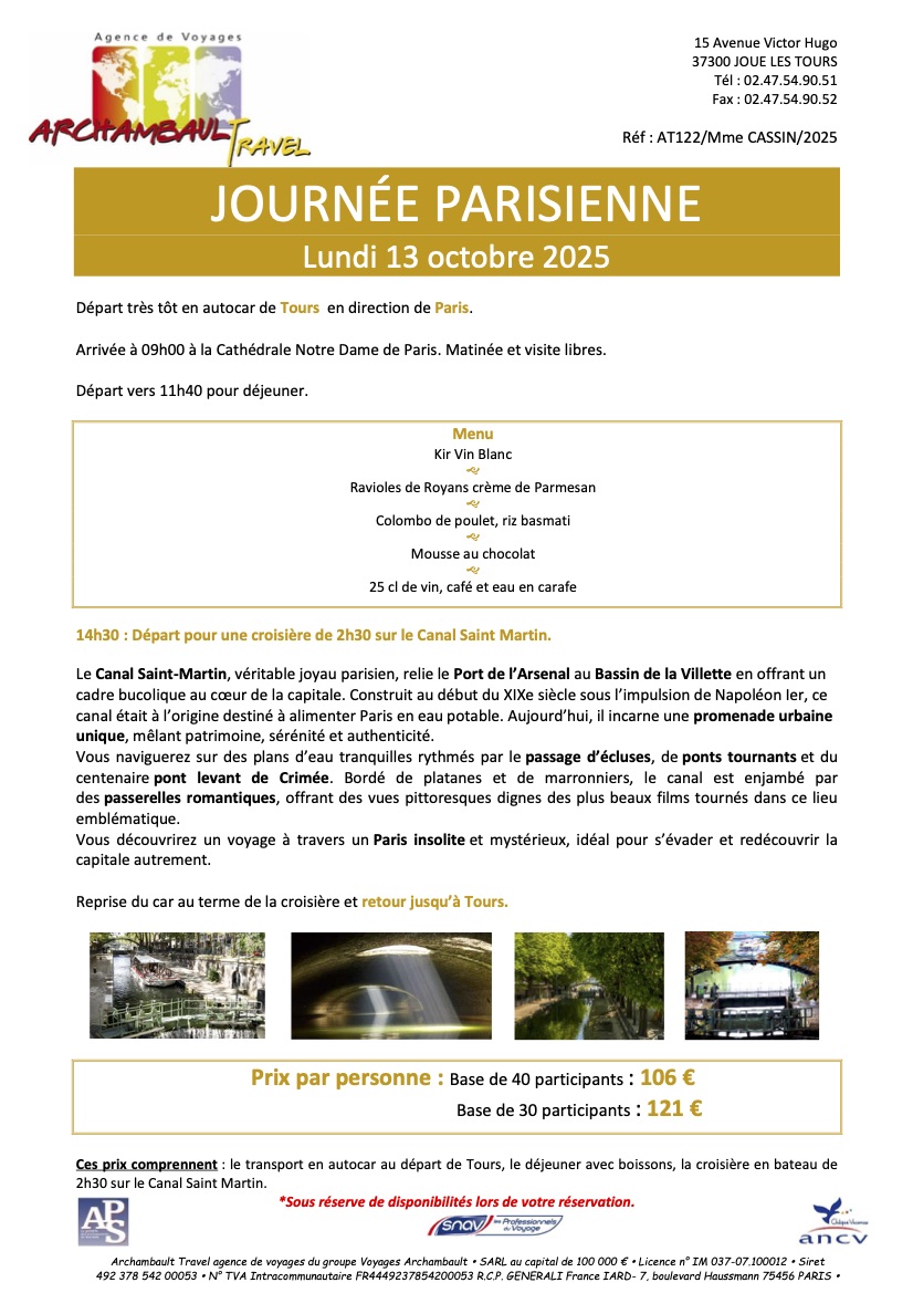 Sortie d’Automne ! SORTIE JOURNEE PARISIENNE : le lundi 13 Octobre 2025 Au programme : VISITE DE NOTRE DAME DE PARIS DEJEUNER CROISIERE SUR LE CANAL SAINT-MARTIN Inscriptions et renseignements dès maintenant lors de nos permanences du mercredi après-midi.